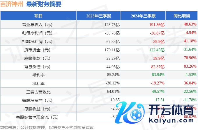 据证券之星公开数据整理,近期百济神州(688235)发布2024年三季报。凭证财报流露,百济神州营收上升弃世收窄。扫尾本禀报期末,公司营业总收入191.36亿元,同比上升48.63%,归母净利润-36.87亿元,同比上升4.94%。按单季度数据看Kaiyun,第三季度营业总收入71.39亿元,同比上升26.95%,第三季度归母净利润-8.09亿元,同比下落160.36%。