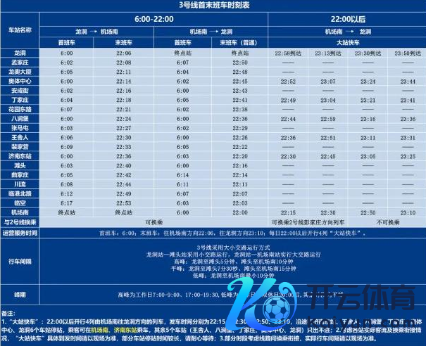 3号线二期初期运营后,济南地铁线网运营做事时期将同步优化调节,1号线为6:00-22:00;2号线为6:00-22:19;3号线首班车时期为6:00,往机场南站主义的末班车时期为22:06,往龙洞站主义的末班车时期为23:10,逐日22:00以后开行4列“大站快车”。