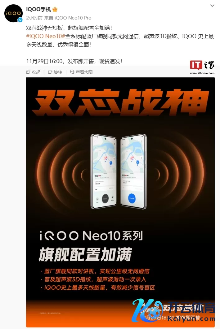 IT之家 11 月 27 日音书,iQOO 本日再次发文预热旗下 Neo10 系列新机:新机全系标配蓝厂旗舰同款无网通讯、超声波 3D 指纹,领有 iQOO 史上最多天线数目。