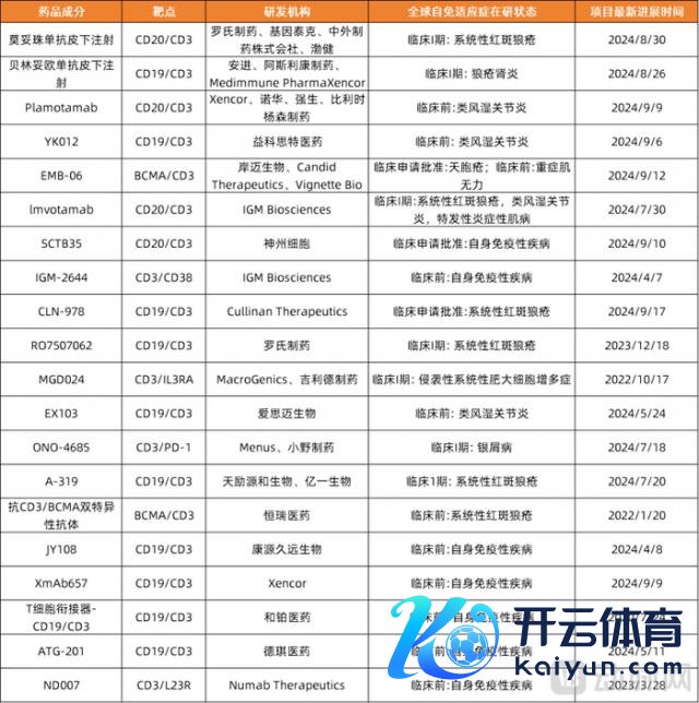 终末还值得包涵的是T细胞衔尾器(T cell engager, TCE)时期在自免限度的崛起。2024年,业内密集收购TCE双抗金钱,据动脉智库不透顶统计,在2024年6起NewCo交游中,TCE关连管线交游占5起。在临床端,现在各人共有20余款处于活跃现象的TCE药物开展了自免关连的临床斟酌,主要联络在 CD3×CD19、CD3×CD20、CD3×BCMA等靶点组合类型。