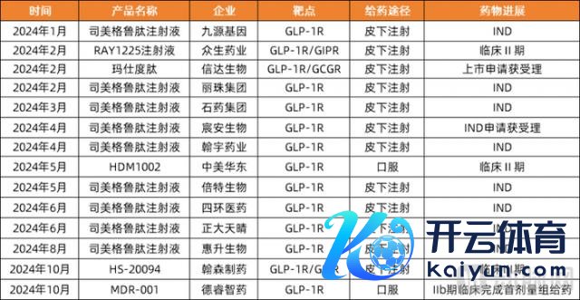 仅在2024年(数据公法2024年11月20日),国内得到里程碑进展的GLP-1类减重管线就多达16款(包括诺和诺德和礼来获批上市的居品)。除已获批上市居品外,现在程度最快的是信达生物的玛仕度肽,已于2024年2月得到NMPA受理对于减重得当症的上市肯求,是各人首个陈诉上市的GLP-1R/GCGR双重兴隆剂,有望成为首个国产双靶点减重药。