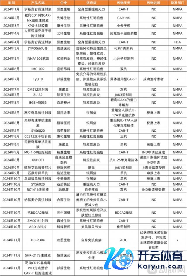 2024年,自免限度研发热火朝天。据动脉智库不透顶统计,公法2024年11月20日,在国内有超30款自免药物迈入过错临床节点。CAR-T、干细胞疗法、ADC、双抗、三抗等各样疗法在自免限度随地吐花,得当症涵盖系统性红斑狼疮、特应性皮炎、银屑病、白癜风、斑秃、重症肌无力等各样疾病。在这些取得里程碑进展的临床管线中,有三点值得包涵。