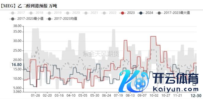 截止12月30日,华东主港地区MEG口岸库存约46.1万吨,环比去库9.3万吨。从到港量来看,12月23日-12月29日瞻望到港6.5万吨,骨子到港2.9万吨,到港偏少大幅去库。12.30-1.5,瞻望到货总量在16.8万吨隔邻,到港偏高,库存或累库。节前聚酯工场乙二醇原料备货天数12.6天(环比+0.9天)。卑劣备货增多。