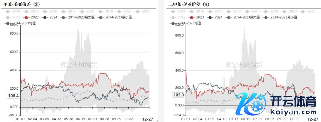 好意思亚套利价差走强,甲苯好意思亚价差108元,二甲苯好意思亚价差105好意思元。据闻运脚裁减,芳烃纸面套利价差部分掀开。好意思国可能存在季节性备货,1-2月或有芳烃韩国出口好意思国。