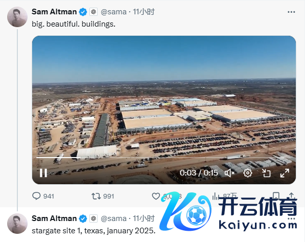 OpenAI首席实施官山姆·奥特曼当地本领1月23日在外交媒体共享了一段“星际之门”在好意思国得克萨斯州首期工场的视频。“星际之门”项筹划首个东谈主工智能数据中心位于得克萨斯州阿比林,占地约875英亩开yun体育网,预测将于2026年建成,将提供57个全员责任岗亭。